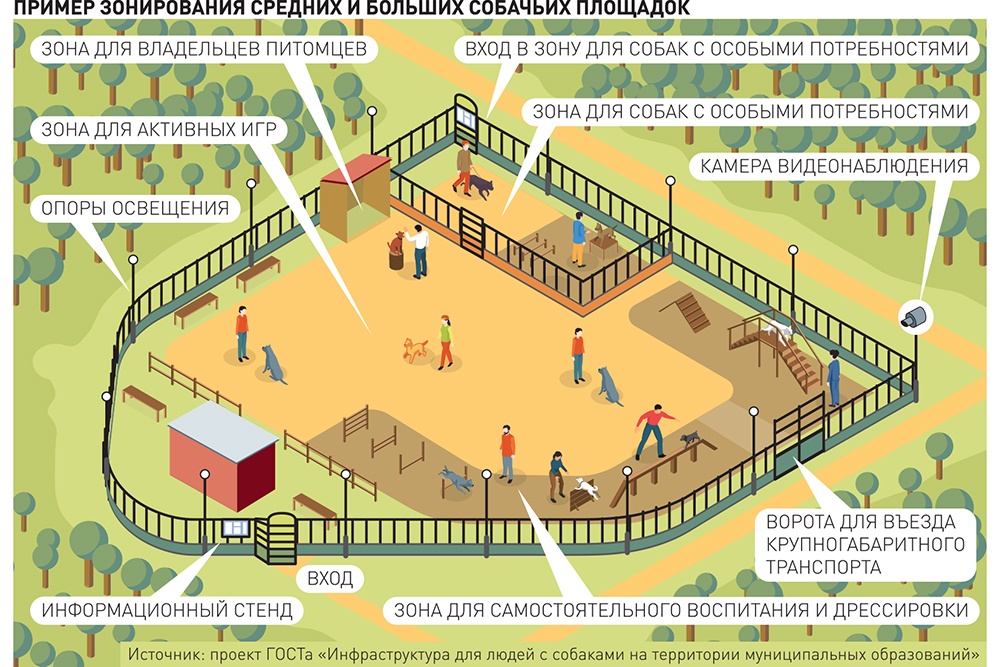 До сих пор, подчеркивают в ведомстве, требования к обустройству мест для выгула, дрессировки и игр с животными нормативно не были закреплены. Теперь определены конкретные параметры для таких территорий. Так, минимальная площадь игровой площадки составляет 200 квадратных метров, а дрессировочной — 1500 квадратных метров. Высота ограждения площадок должна быть не менее 2 метров. Предусматриваются зоны для уборки отходов с контейнерами и дозаторами для пакетов. Установлены требования к освещению, зонированию, установке оборудования для владельцев и препятствий для собак. Покрытия площадок должны быть травмобезопасными — из песчано-гравийной смеси, прорезиненных или комбинированных материалов.